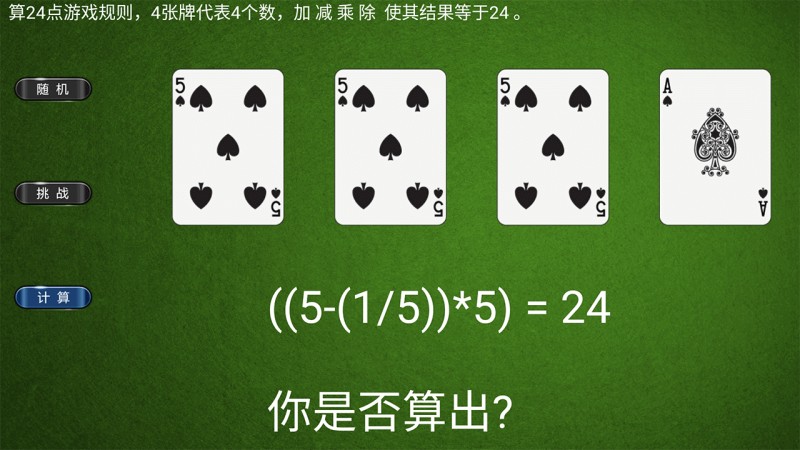 使用扑克牌随机抽取四张(移除花色,只看点数),玩家需要利用加、减、乘、除四种基本运算,在不改变数字顺序自由组合的情况下,让最终结果等于 24。